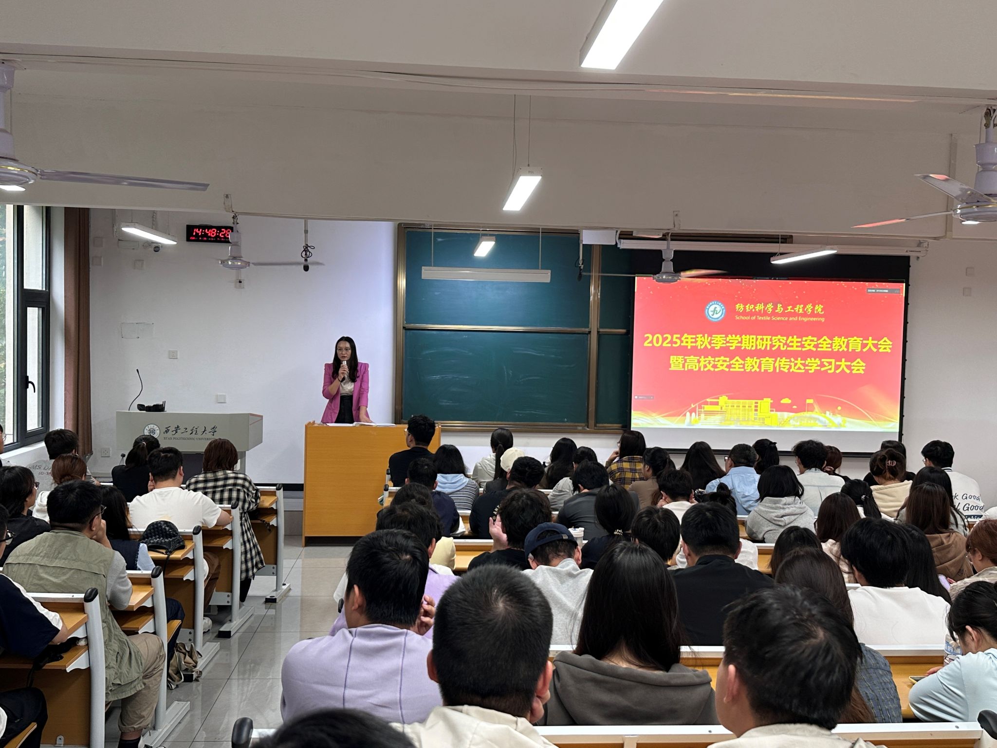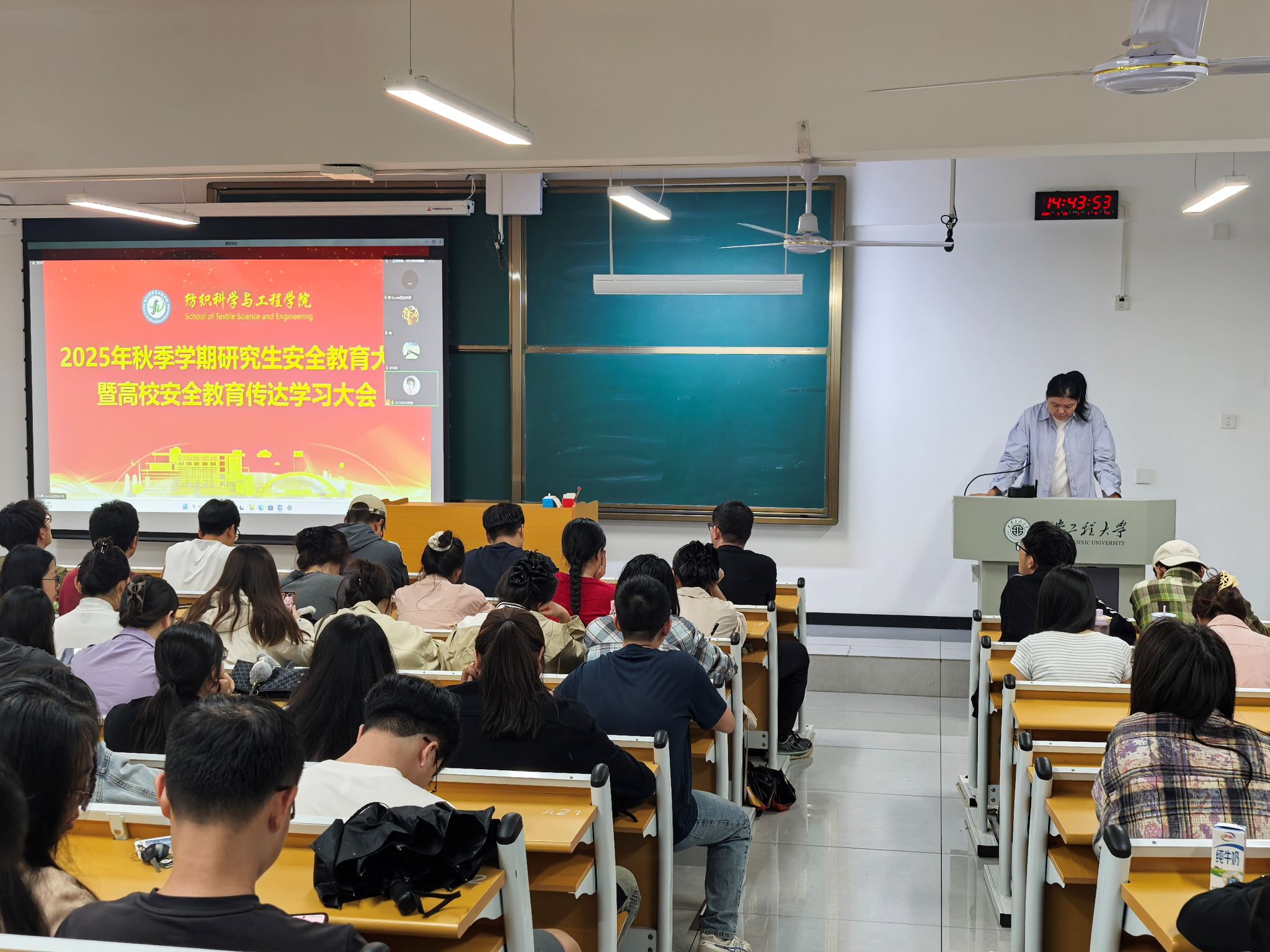 为深入贯彻落实学校新学期安全教育工作部署,进一步提高学生安全意识和自我防护能力,纺织科学与工程学院组织开展了2025年秋季学期“开学安全教育第一课”。学院本科四个年级辅导员邓恩征、赵森、曹鑫、洪小洋以及研究生辅导员姚婕、苏娜,分别召开年级大会,面向全体在校学生传达会议精神并开展专题教育。