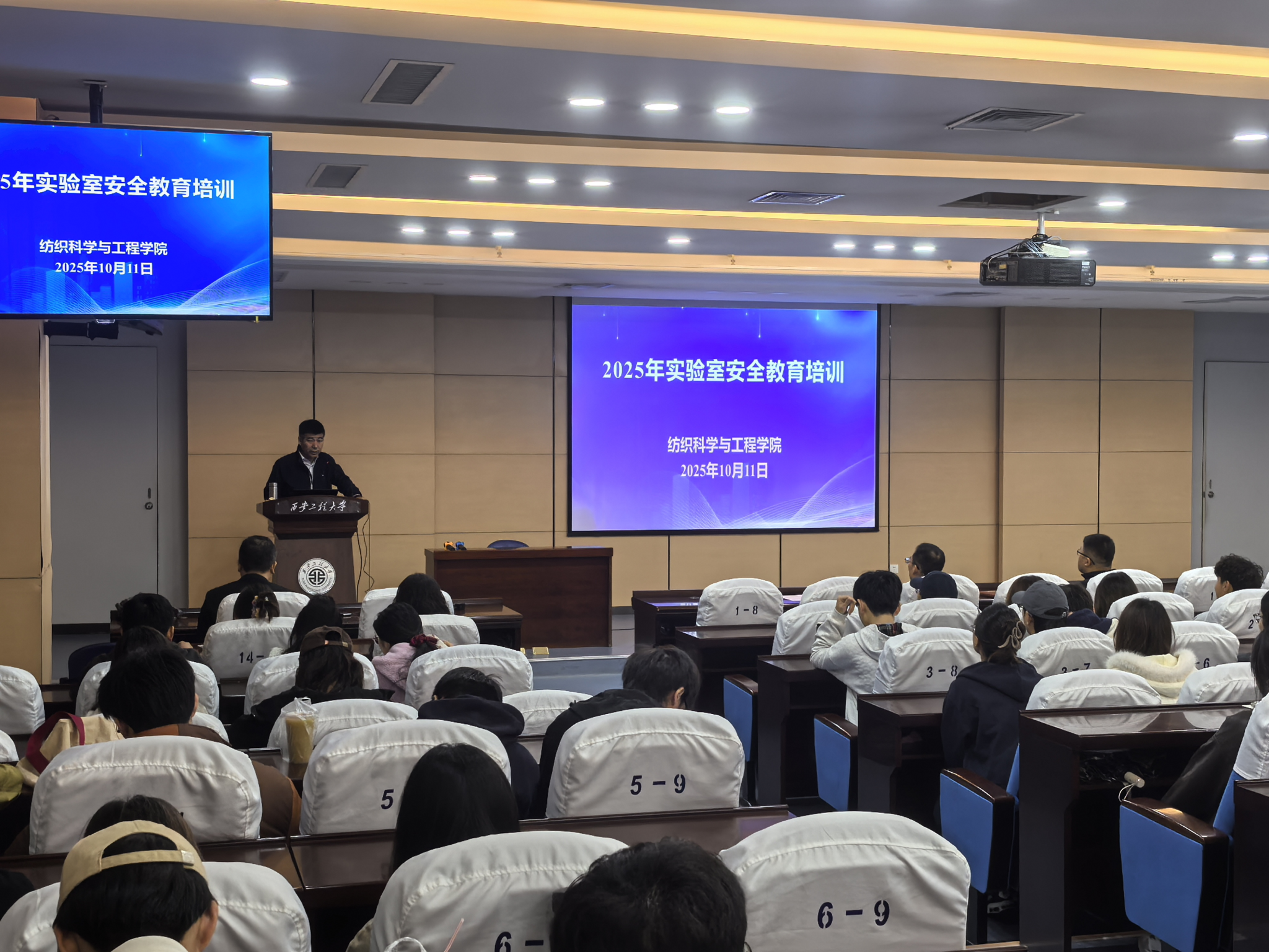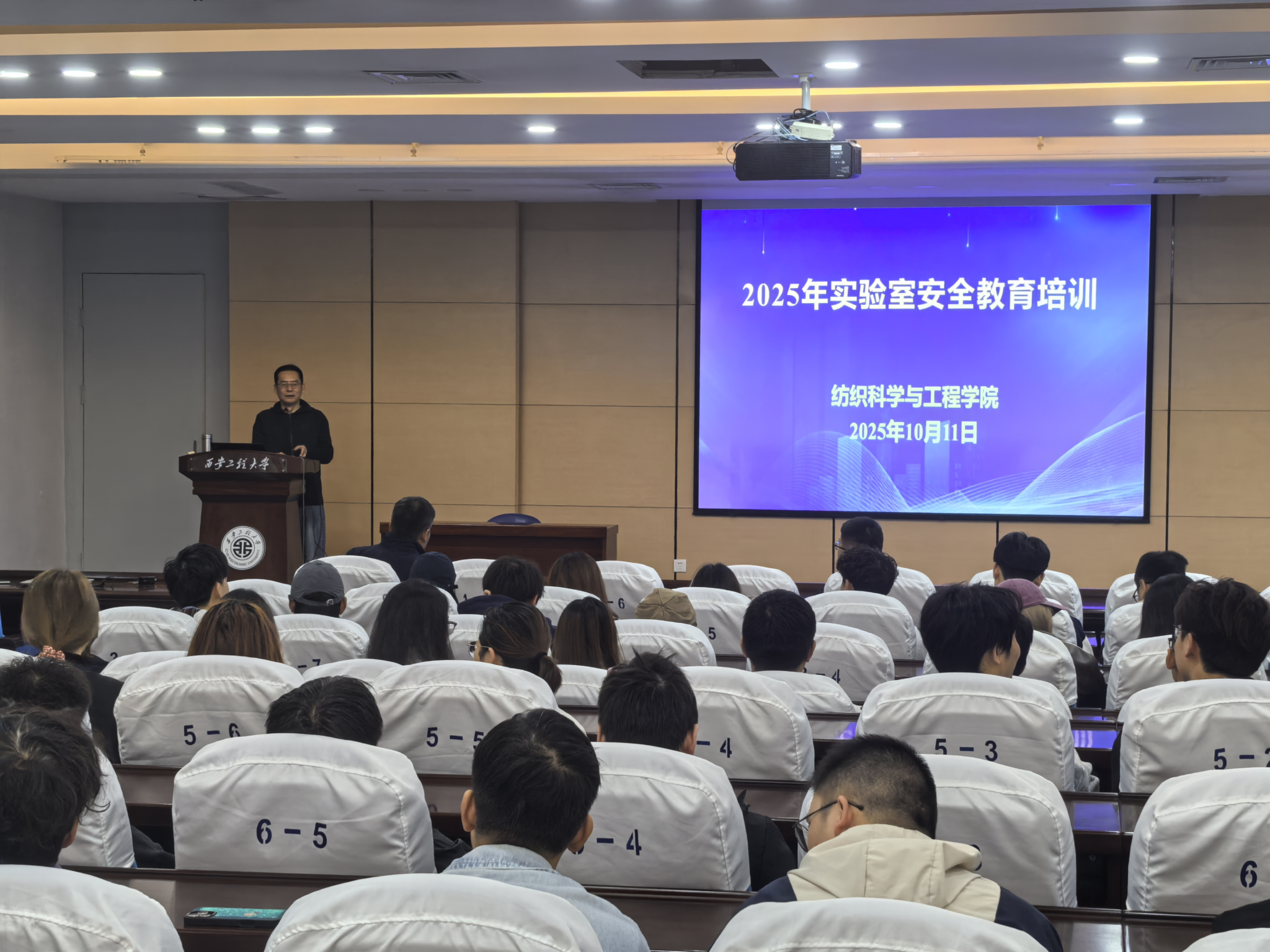 2025年10月11日,为切实增强实验室安全管理水平,提升师生的安全防范与操作技能,纺织科学与工程学院在金花校区如意报告厅组织举办实验室安全教育专题培训。本次培训由学院资产与实验管理处、校稳定安全工作办公室联合主办,特邀西安安备思软件有限公司总经理刘涛担任主讲。学院党委书记李伟、副院长张鹏飞参加活动,2025级全体研究生、实验室管理人员等130余人到场学习。培训由张鹏飞主持。