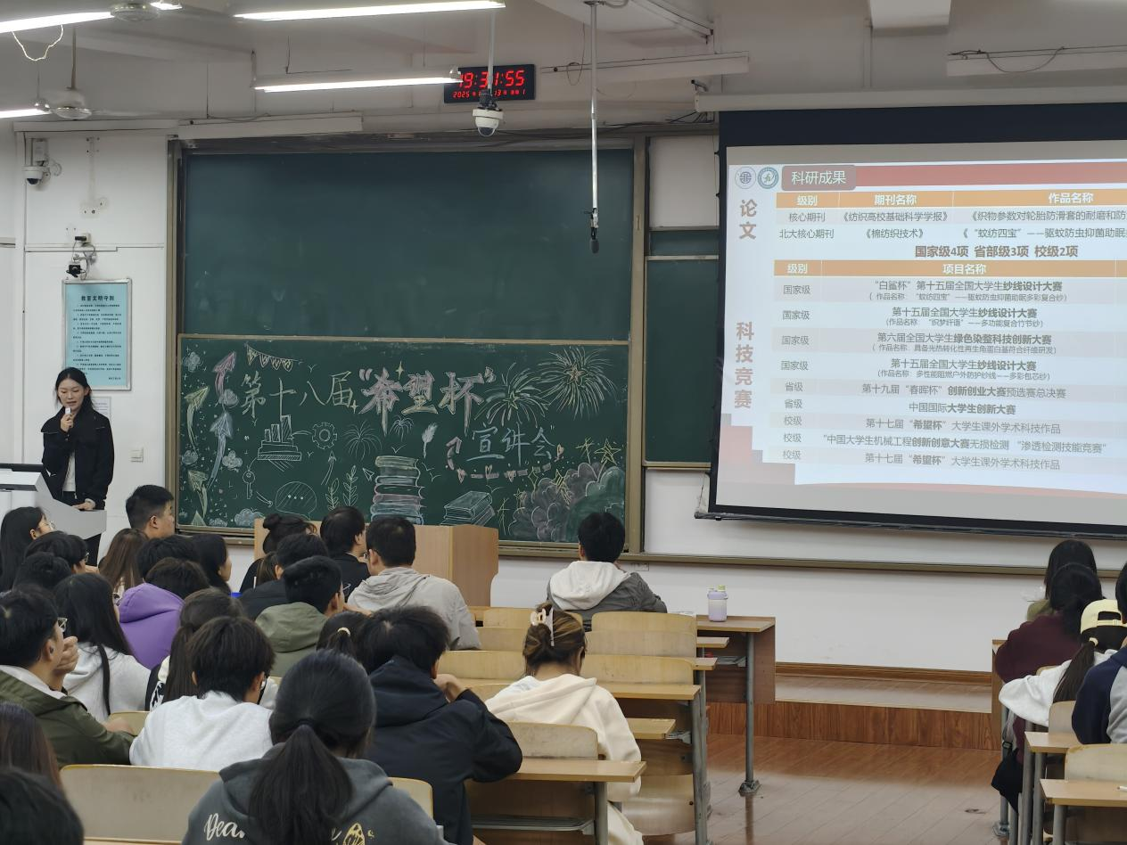 为进一步激发同学们参加“希望杯”竞赛的兴趣和热情,营造浓厚的校园科创氛围,2025年10月13日晚上七点,纺织科学与工程学院大学生科技协会在临潼校区教学楼B-237教室举办第十八届“希望杯”大学生创业计划竞赛宣讲会,邀请到2022级朱子珺同学为大家分享独家实战经验、心路历程与“避坑”指南,2025级全体新生参与了此次活动。活动由学院大学生科技协会信息外联部成员常静主持。