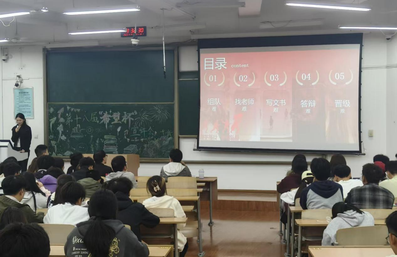 宣讲中,她以“五难”:组队难、找老师难、写文书难、答辩难、晋级难入手,直击学生痛点,瞬间拉近了与听众们的距离。随后,她针对每一个“难”点,都给出了清晰的“破题”思路。这番讲解,如同为同学们描绘了一幅清晰的“闯关”蓝图,让曾经的“拦路虎”变成了可逐个击破的“纸老虎”,给同学们吃了一颗“定心丸”。
