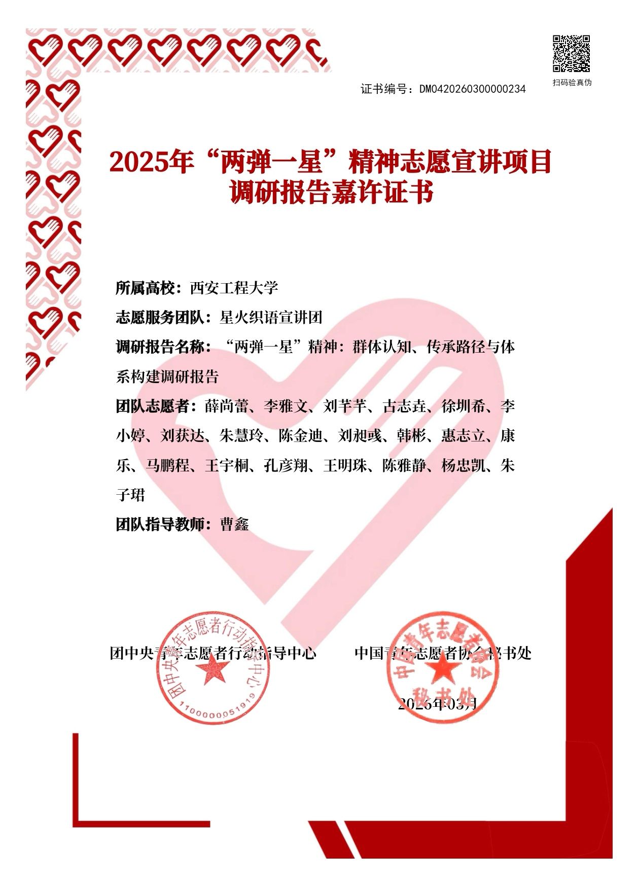 近日,2025年全国大学生“两弹一星”精神志愿宣讲项目评选结果公布。我院“星火织语宣讲团”凭借扎实的调研工作与高质量的调研报告,从全国众多参评团队中脱颖而出,荣获团中央青年志愿者行动指导中心、中国青年志愿者协会联合颁发的嘉许证书,展现了我校青年学子传承红色基因、践行志愿精神的青春风采与过硬实力。