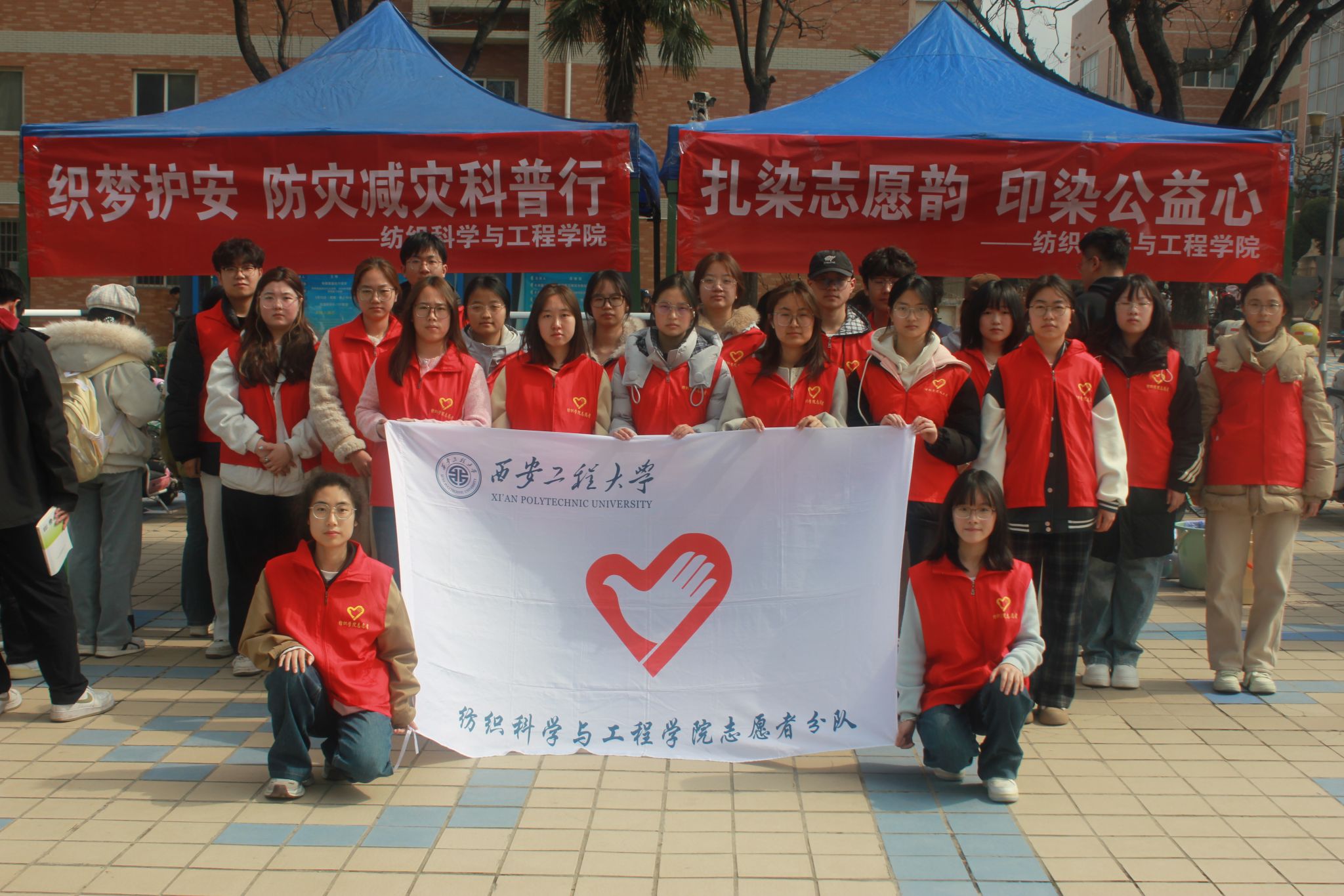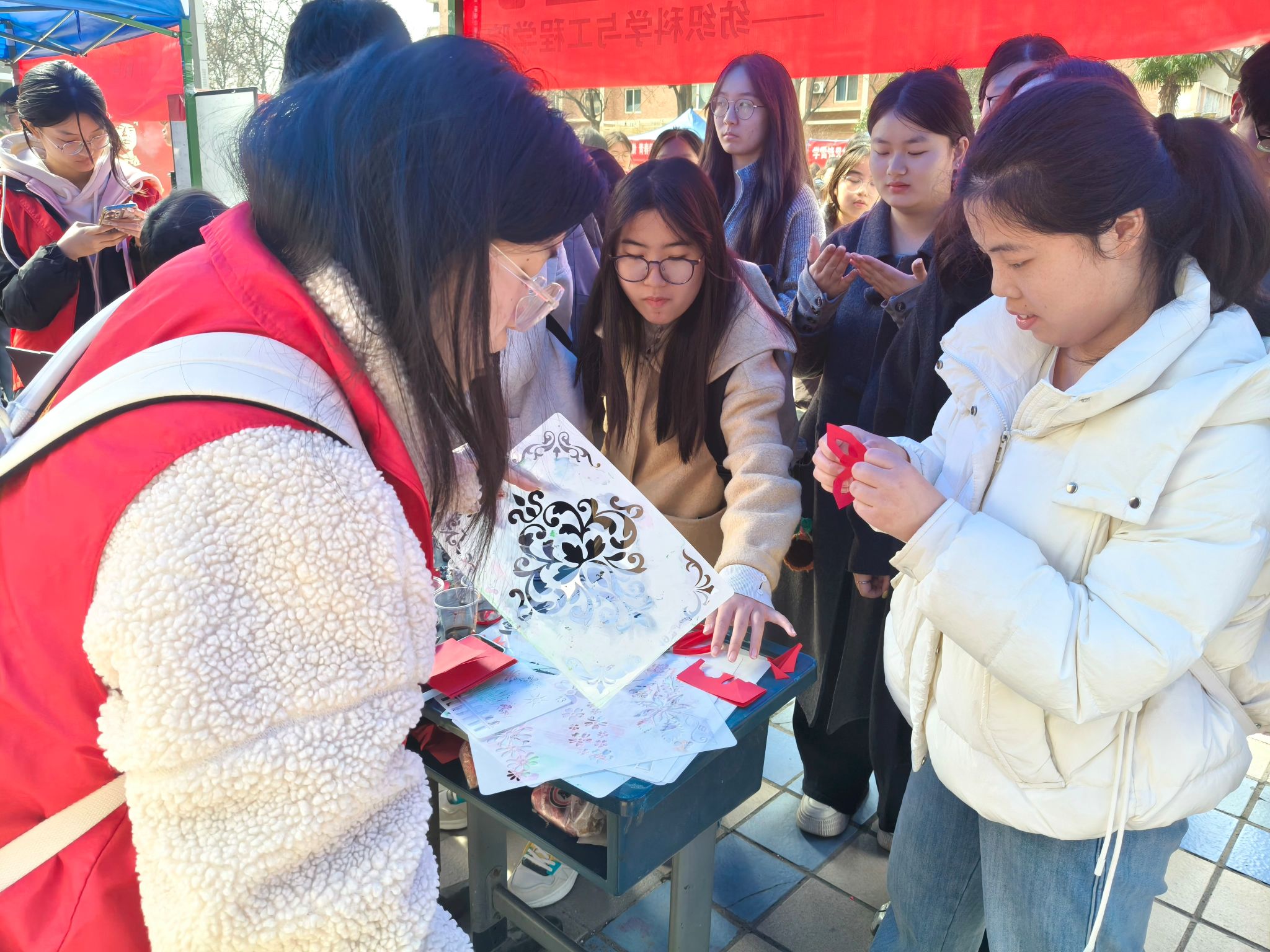 临潼校区中心广场上,“扎染志愿韵,印染公益心”志愿服务项目立足专业特色,生动诠释新时代志愿精神。志愿者们以实物展示、工艺科普、沉浸式体验等环节,带领师生感受千年纺织非遗的独特魅力。一块块渐变色扎染方巾、纹样精美的印染作品在大家手中匠心呈现,活动现场同步开展传统技艺保护倡议活动,进一步厚植青年学子非遗传承与文化自信。