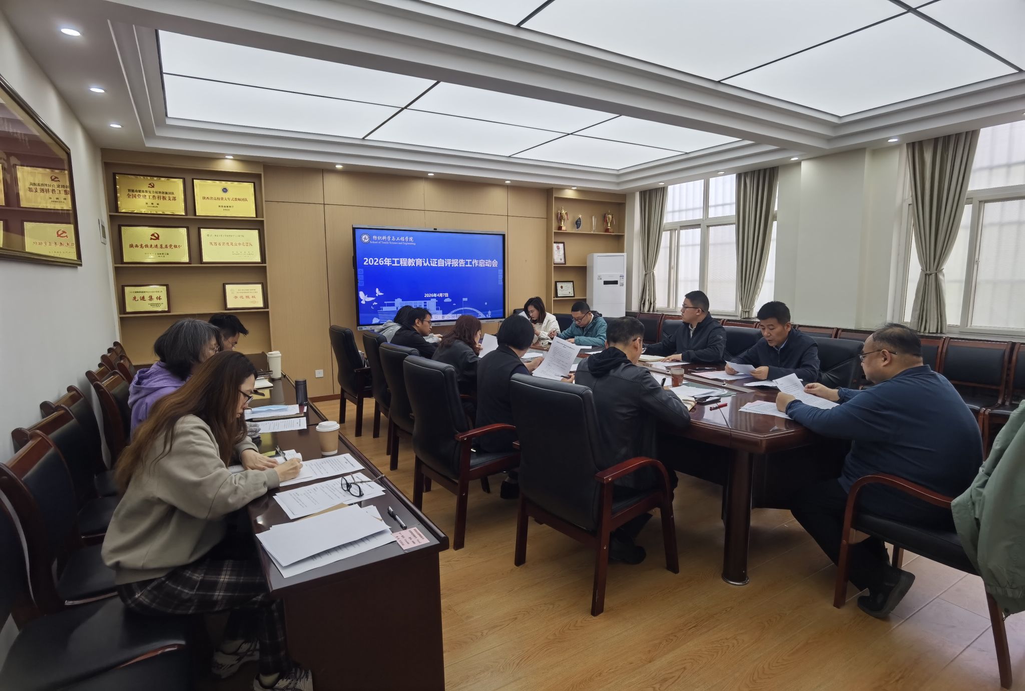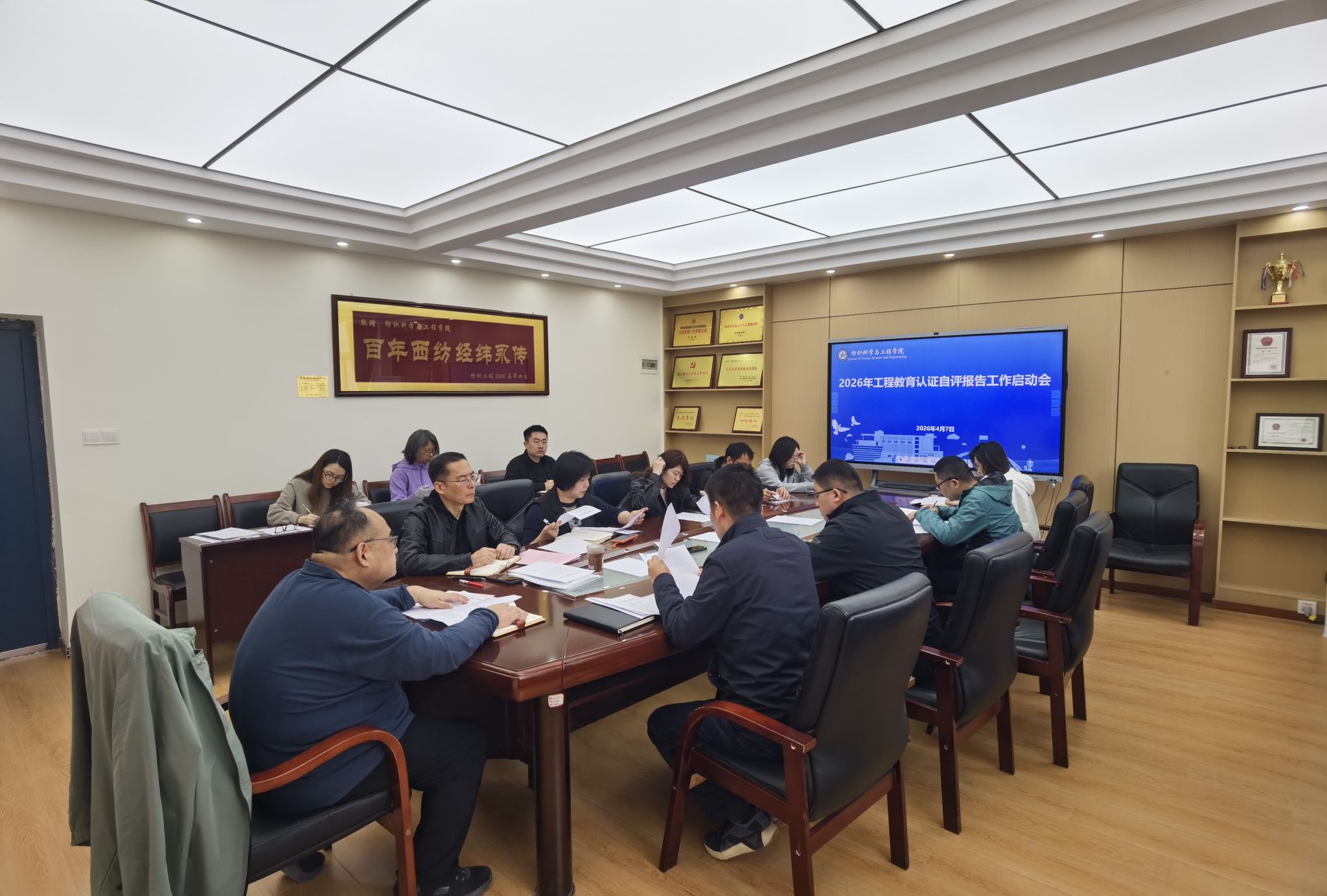 为进一步夯实专业建设基础,提升人才培养质量。2026年4月7日,纺织科学与工程学院召开工程教育认证工作启动会。学院党委书记李伟、副院长刘哲(主持工作)、副书记朱宇军、副院长张鹏飞、院长助理姚一军、纺织工程系主任王永臻、非织造材料与工程专业负责人窦皓、各系部主任、学院办公室主任周芸、辅导员及教学秘书参加了此次会议。会议由张鹏飞主持。