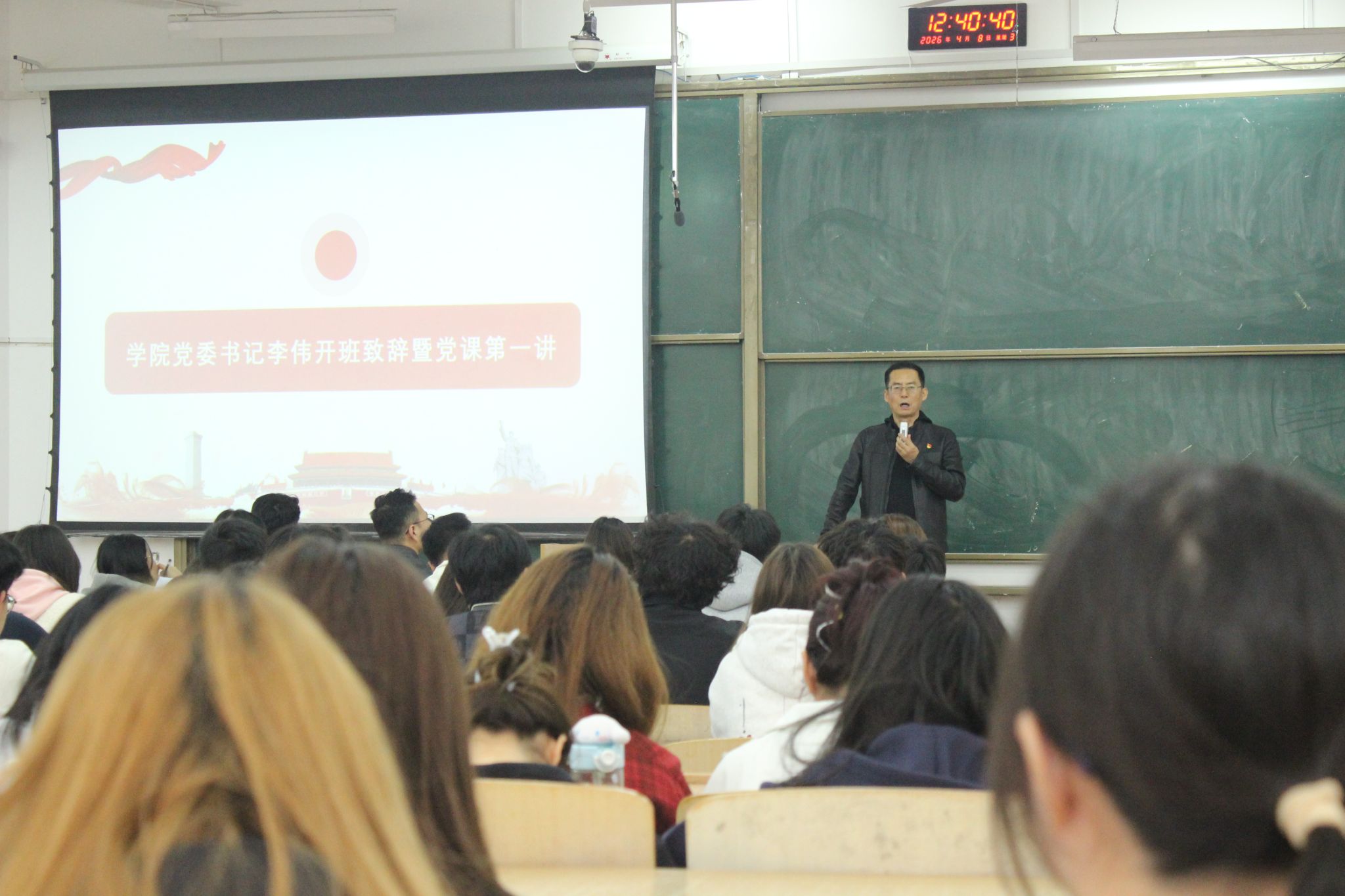 为深入学习和贯彻习近平新时代中国特色社会主义思想,规范党员发展工作,加强对入党积极分子的培养教育,2026年4月8日,纺织科学与工程学院在临潼校区B133教室举办2026年上半年入党积极分子培训班开班仪式暨党委书记讲党课活动。学院党委书记李伟、党委副书记朱宇军、正科级组织员李颖慧、学生党支部书记以及300余名入党积极分子参加活动。