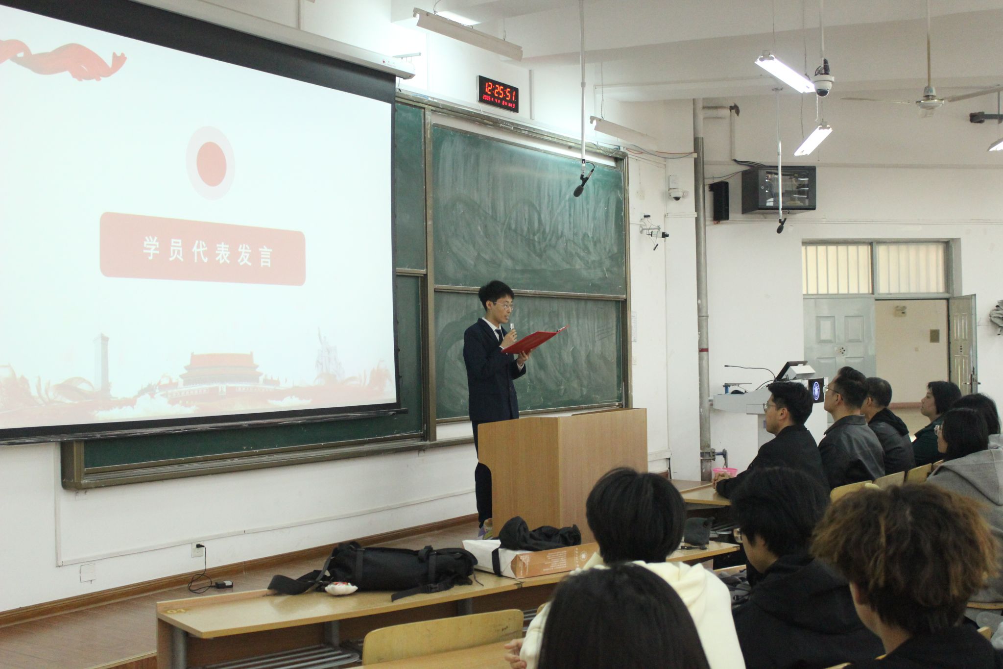 接着,2024级纺织工程专业6班学生李宜洲作为学员代表发言。他结合纺织专业特色谈到,纺织先辈以匠心守初心、以实干担使命,“梦桃精神”所蕴含的爱岗敬业、甘于奉献、团结奋进的精神,是纺织学子根植于心的精神底色。他表示,青年理想必须与国家建设、行业发展同频共振,作为入党积极分子将以更高标准要求自己,牢记习近平总书记的教诲,在学思践悟中坚定信念,以饱满的热情与实际行动完成培训。