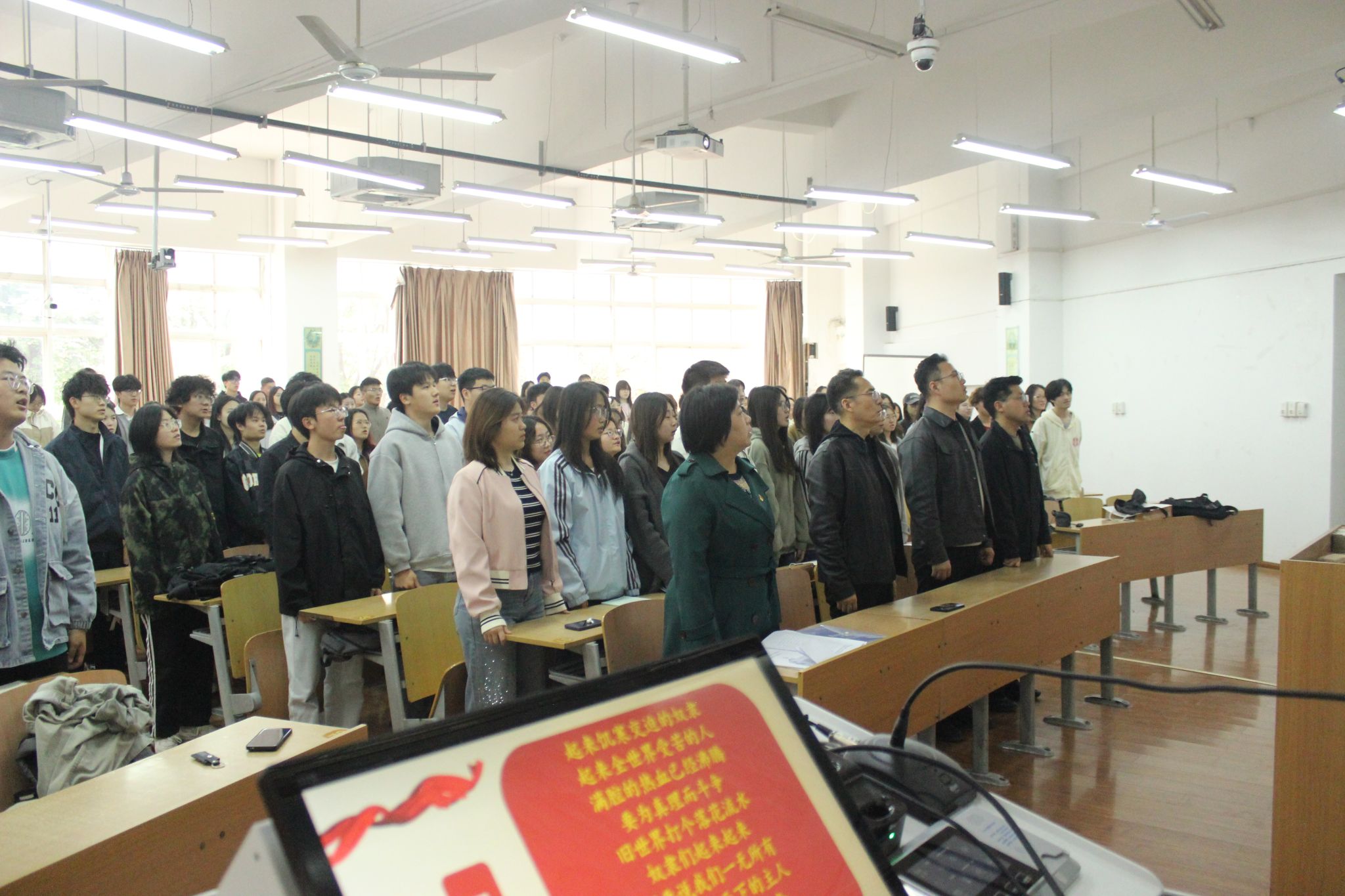 开班仪式在庄严的《国际歌》声中拉开帷幕。首先,朱宇军宣读《关于举办纺织科学与工程学院2026年上半年入党积极分子培训班的安排意见》,她介绍了本次培训的具体安排,并详细说明了讲座时间、学习内容和考核要求,叮嘱学员珍惜学习机会、严守培训纪律、认真完成任务,确保学有所获、学有所成。