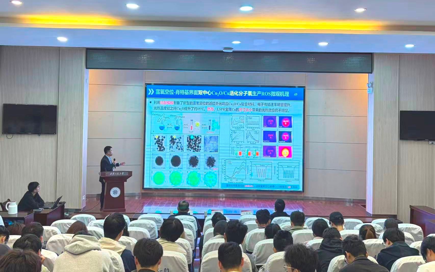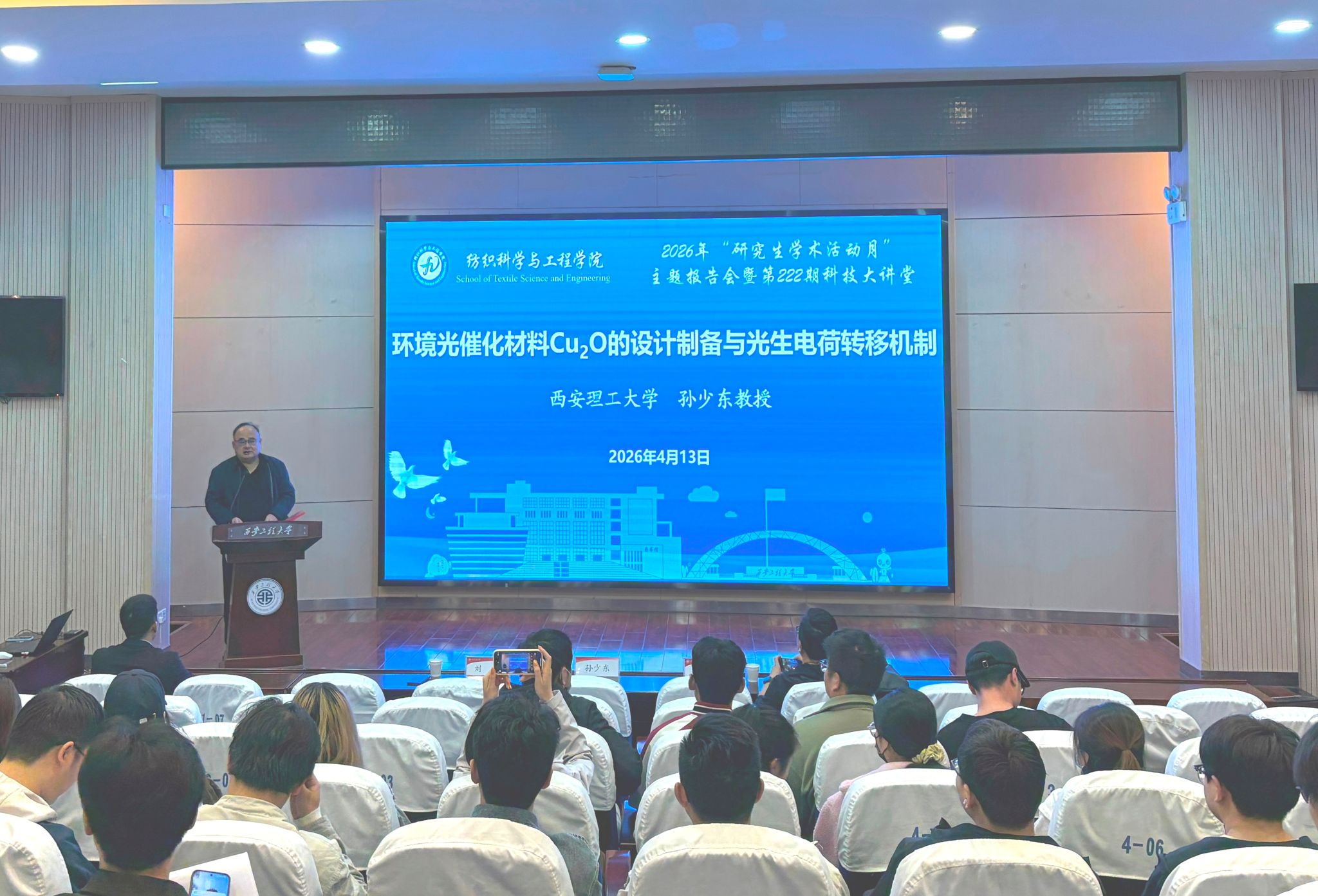 4月13日,纺织科学与工程学院在金花校区图书馆西纺报告厅举办2026年“研究生学术活动月”主题报告会暨第222期科技大讲堂,特邀西安理工大学孙少东教授作题为“环境光催化材料Cu2O的设计制备与光生电荷转移机制”的学术报告。学院副院长(主持工作)刘哲、院长助理王秋实及硕博研究生等100余人参加了学术报告会,报告会由刘哲主持。